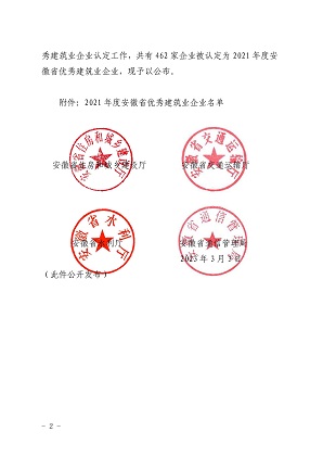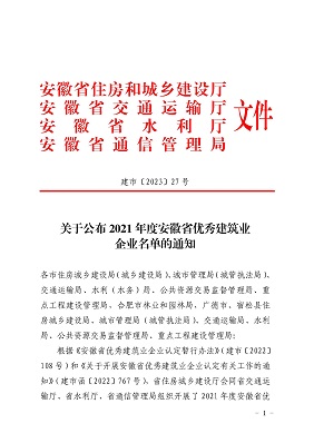 根據《安徽省優(yōu)秀建筑業(yè)企業(yè)認定暫行辦法》和《關(guān)于開(kāi)展安徽省優(yōu)秀建筑業(yè)企業(yè)認定有關(guān)工作的通知》。省住房城鄉建設廳會(huì )同省交通運輸廳、省水利廳、省通信管理局組織開(kāi)展了2021年度安徽省優(yōu)秀建筑企業(yè)認定工作。