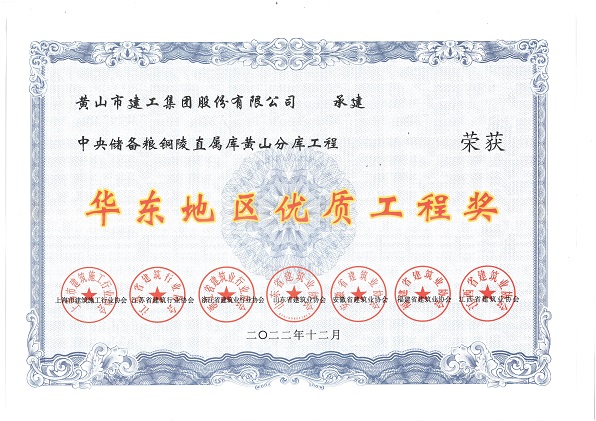 由黃山建工集團股份有限公司承建的“中央儲備糧銅陵直屬庫黃山分庫工程”榮獲華東地區各省建筑業(yè)協(xié)會(huì )聯(lián)合頒發(fā)的“華東地區優(yōu)質(zhì)工程獎”。