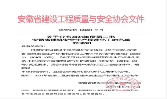 8月17日,安徽省建設工程質(zhì)量與安全協(xié)會(huì )發(fā)布2023年度第二批安徽省建筑安全生產(chǎn)標準化工地名單,黃山建工集團仙人洞南路東側D1地塊(文瀾軒)項目獲評“安徽省建筑安全生產(chǎn)標準化工地”。